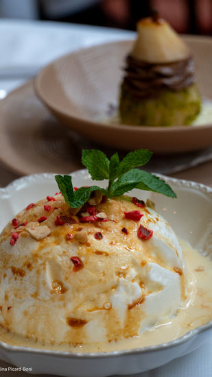 Pruneaux macérés au Pommeau de Normandie et sorbet chocolat